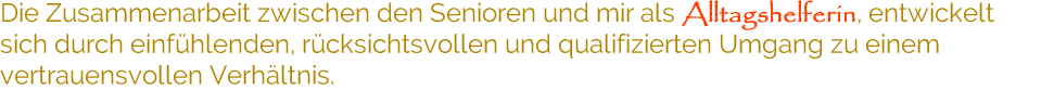 Seit 2017 arbeite ich selbständig als Senioren-Betreuerin und finde dieser Tätigkeit sehr erfüllend. Ich lege großen Wert auf einen wertschätzenden und einfühlsamen Umgang mit den Senioren. Hilfe und Angebote sind immer individuell und werden von mir stets auf die jeweilige Person zugeschnitten.